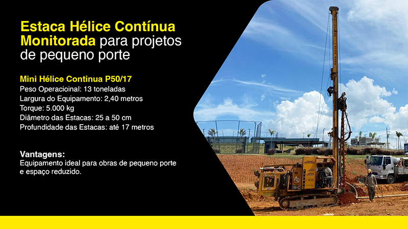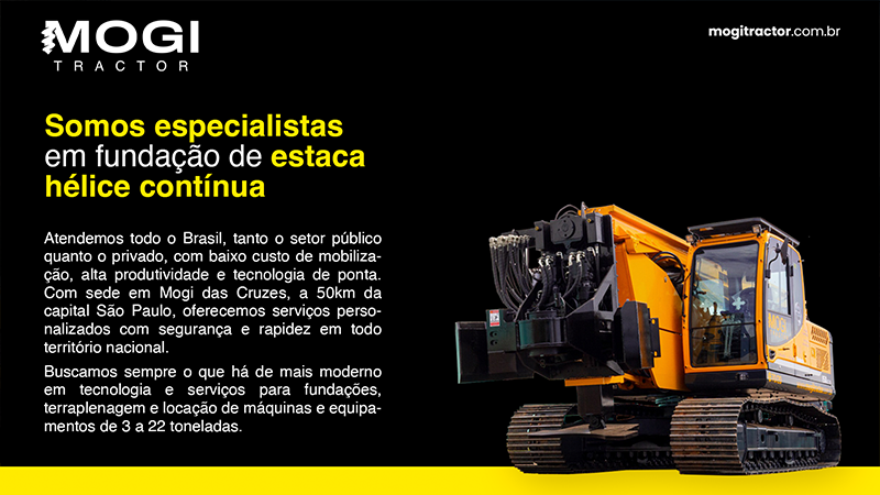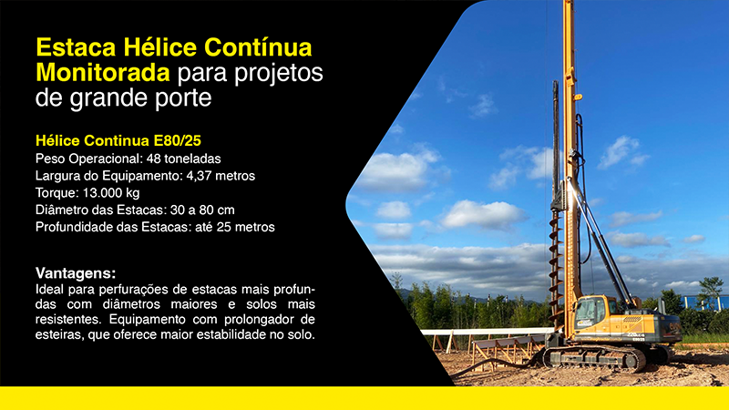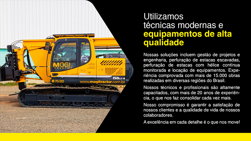 Pegamos a complexidade técnica (Estaca Hélice Contínua, Locação de Máquinas, Terraplenagem…) e simplificamos a mensagem. A apresentação foi desenhada para mostrar que a frota chega em qualquer lugar do Brasil e resolve a fundação rápido. Design limpo para vender um serviço pesado.