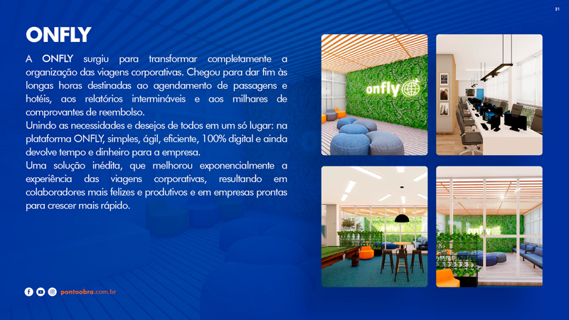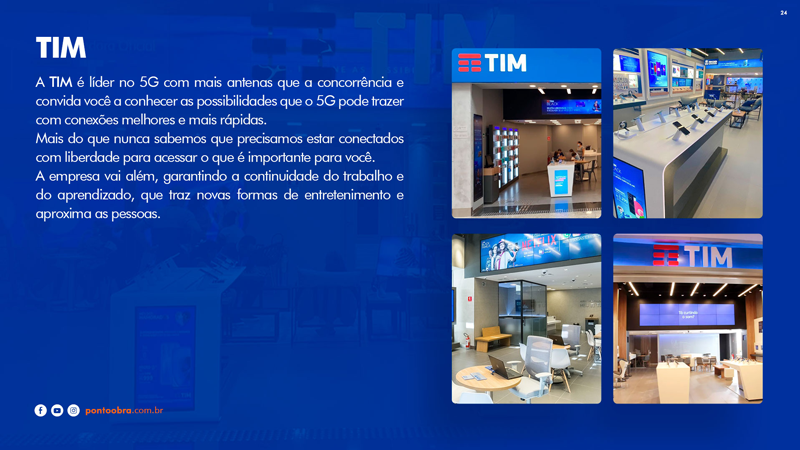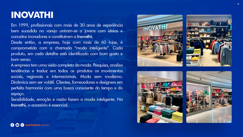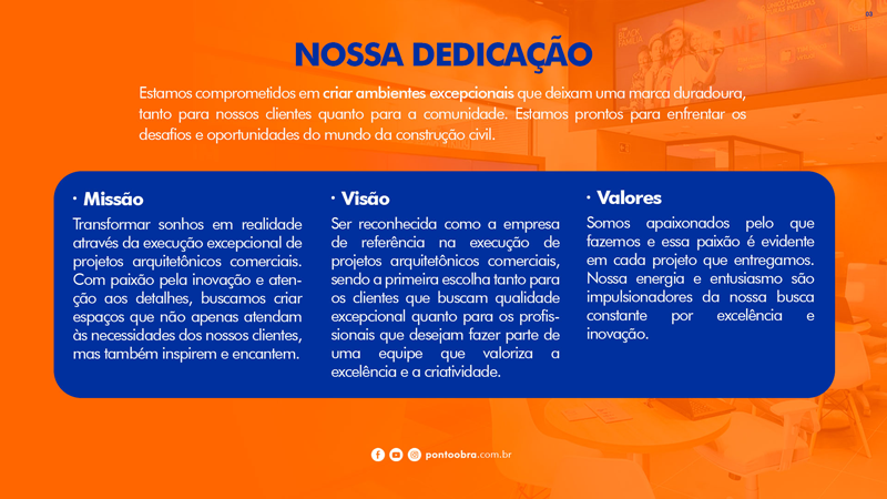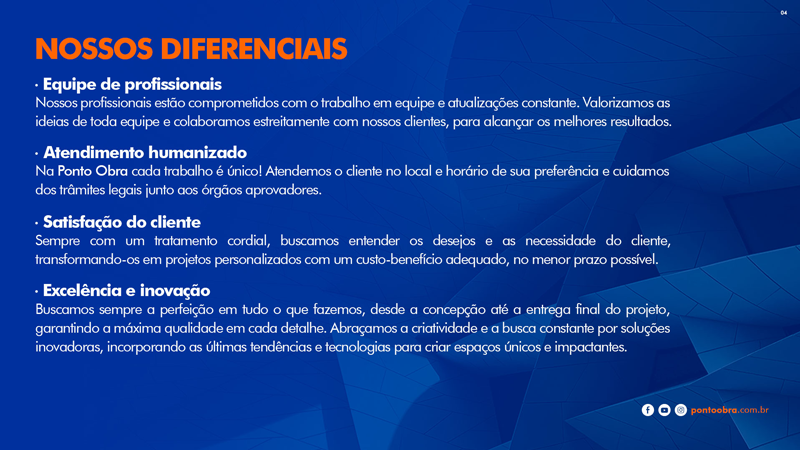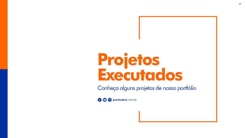 A comunicação visual foi pensada para espelhar a sofisticação dos projetos deles. Usamos uma linguagem visual moderna para mostrar que a Ponto Obra domina as tendências de arquitetura e varejo.